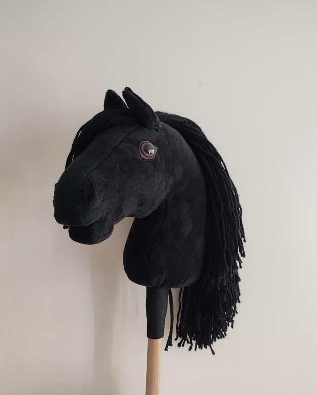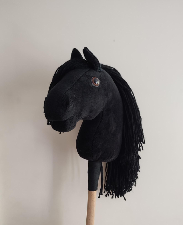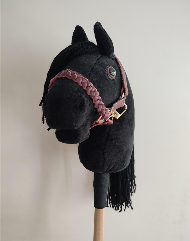 Blackout - koń fryzyjski, maść kara, z wodzami i kantarem z plecionym nachrapnikiem z naturalnej skóry w kolorze bordo. Rozmiar mały + (A4). Koń jest prosty i bardzo dobrze wypełniony, dzięki temu jest stabilny podczas jazdy. Wymiary: konik 28 cm, kijek 30 cm (całkowita długość 58 cm ). Opracowany przez nas model daje wrażenie jazdy na prawdziwym koniu.
